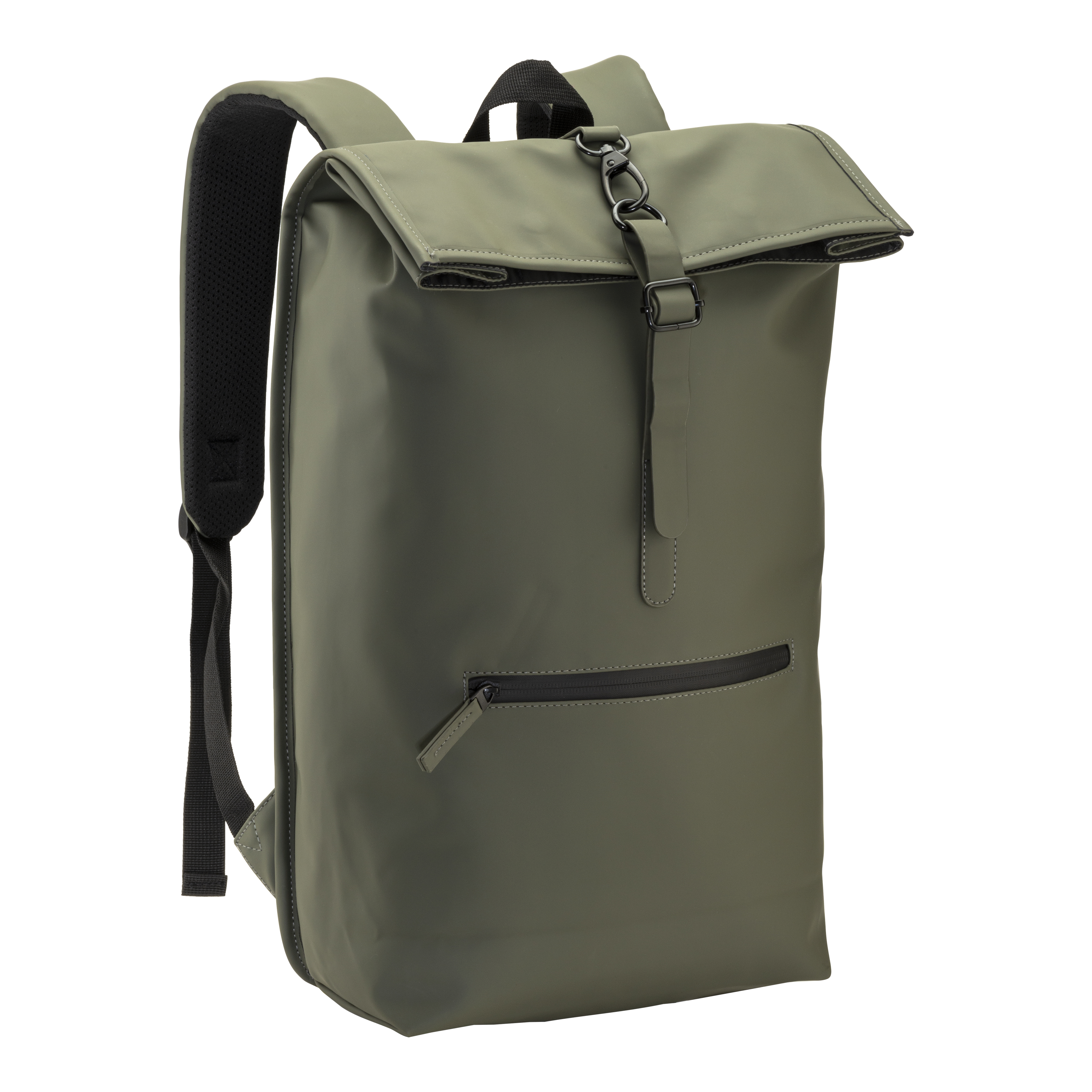 Recycled water-resistant Soft PU (15″) backpack. Padded inside pocket for notebook. Large main compartment, padded back and shoulder straps with breathable material