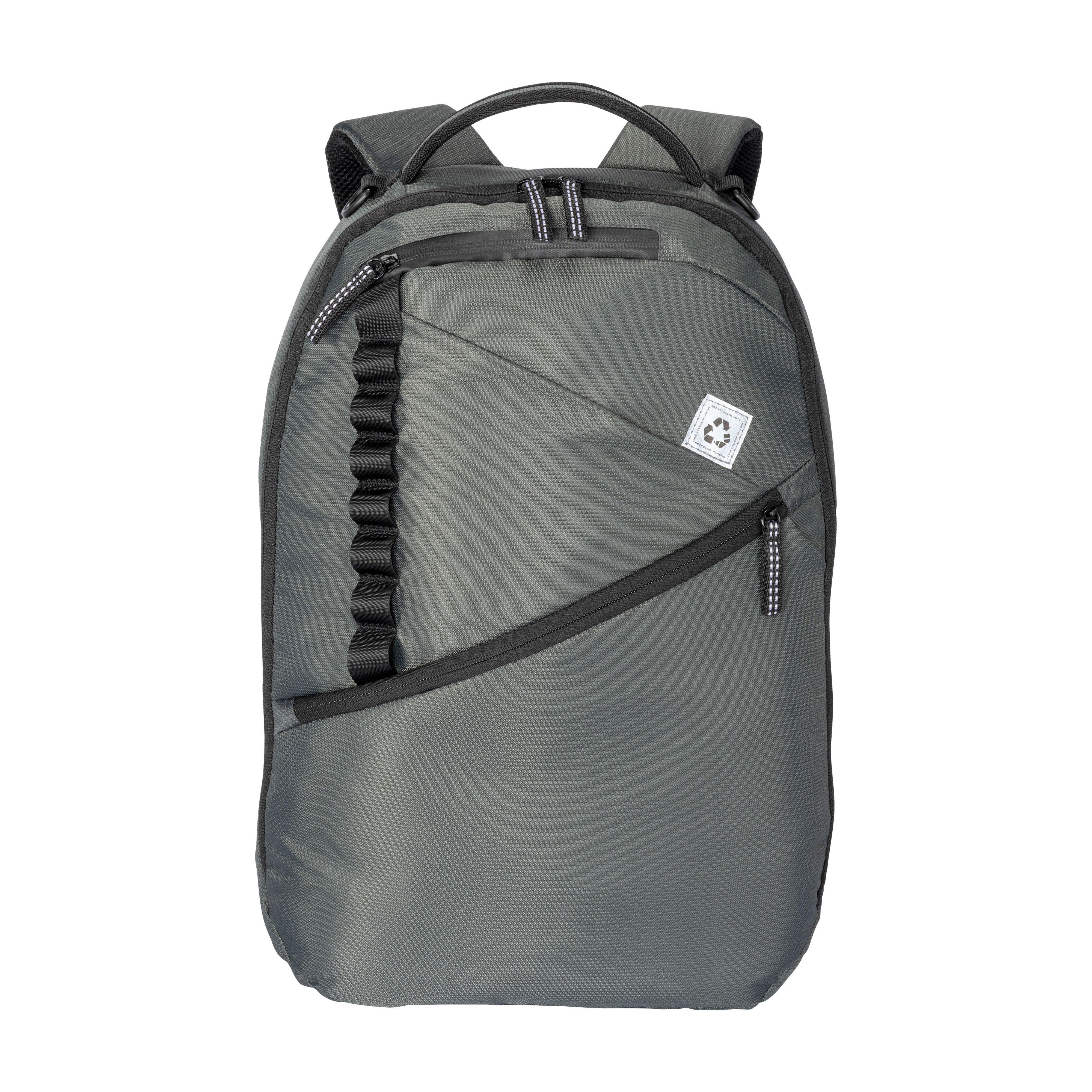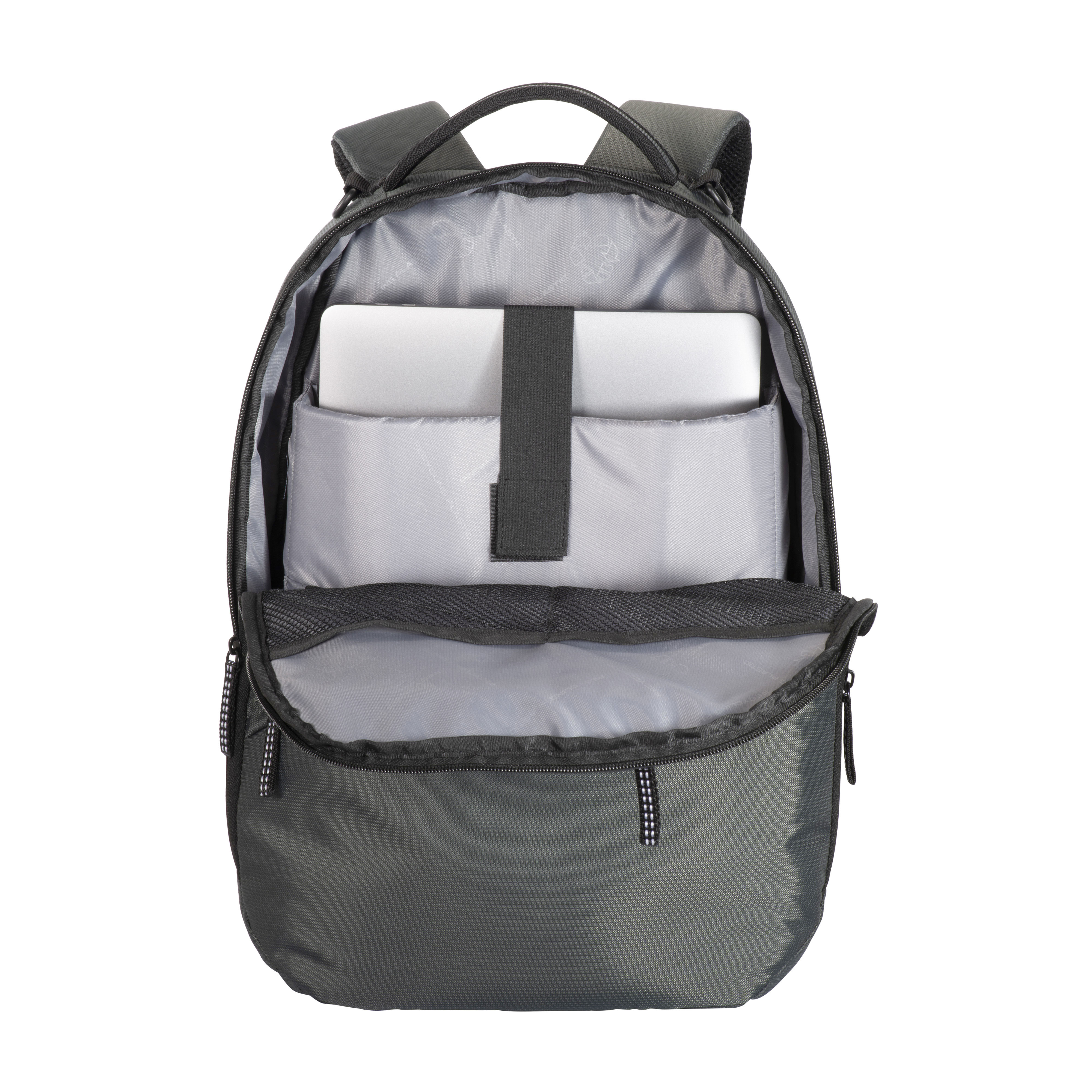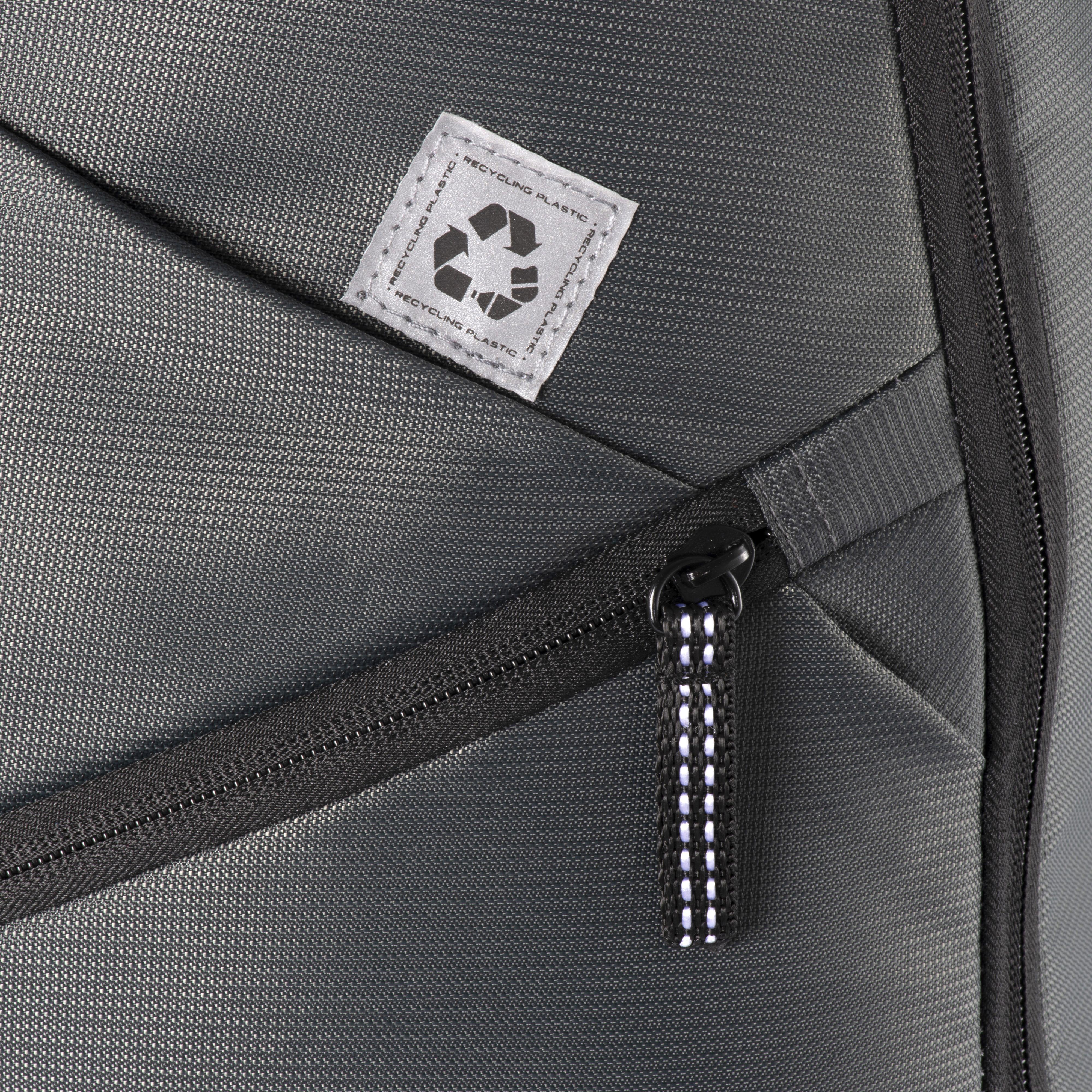 Laptop backpack in recycled PET. Padded notebook compartment. Backrest and shoulder straps padded with breathable material. Trolley attachment system