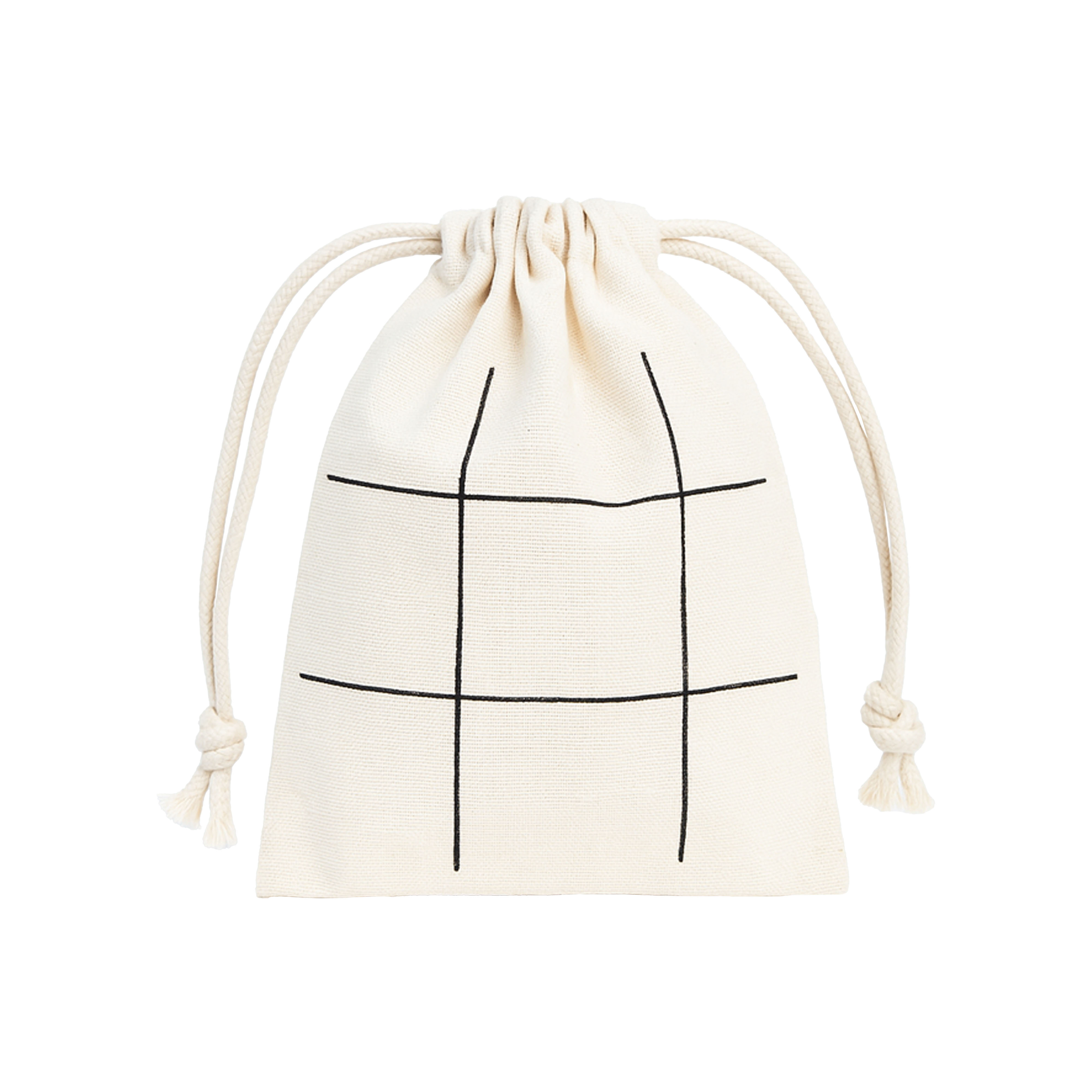 Wooden tic-tac-toe game, with printed tokens and cotton drawstring pouch