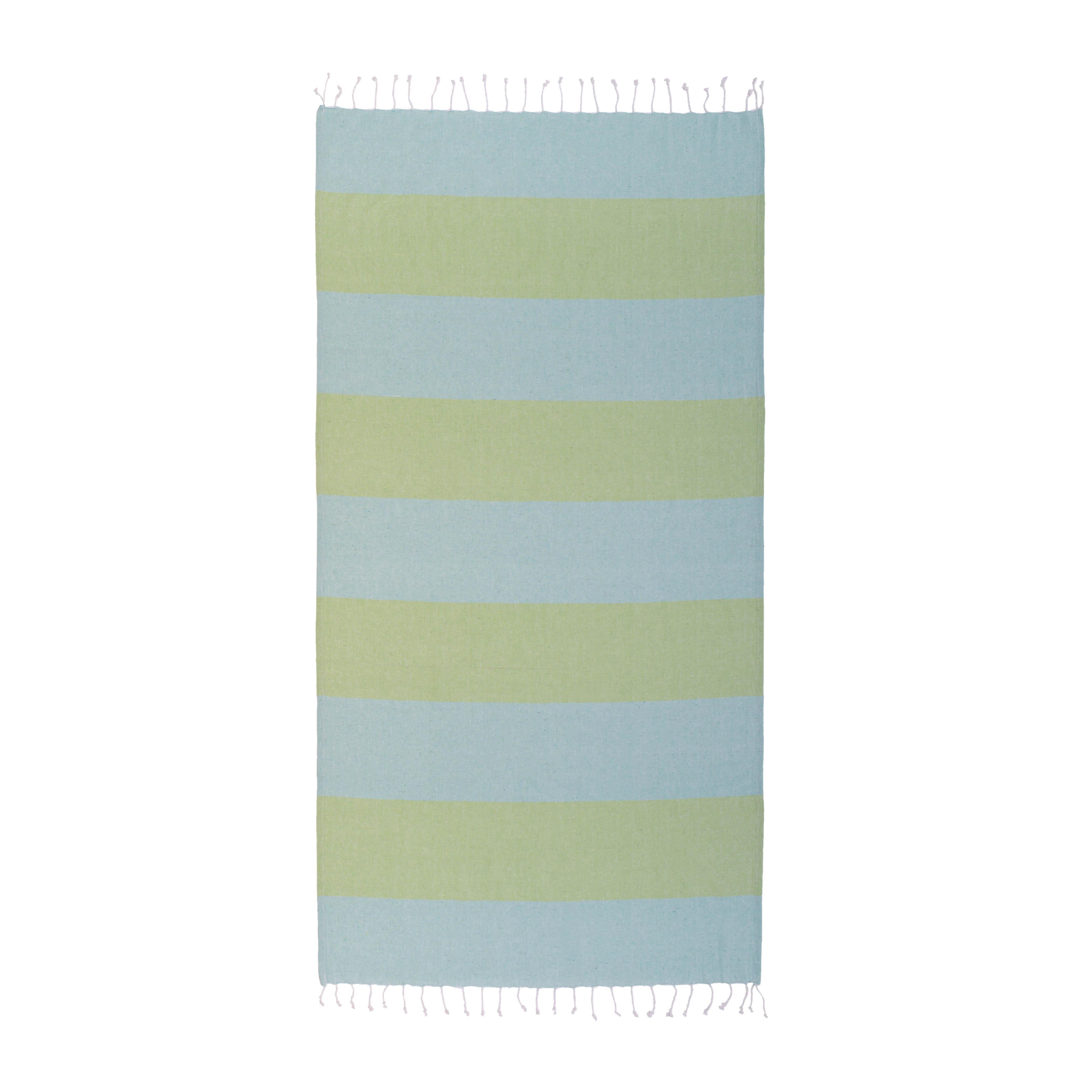 180 g/m2 recycled cotton beach towel with mélange effect, two-tone horizontal large stripe pattern and fringing. It is GRS (Global Recycled Standard) certified