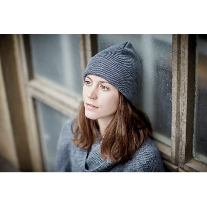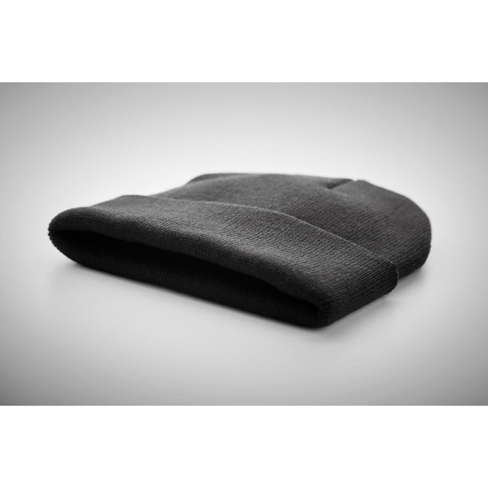 Unisex knitted Beanie hat in soft stretchable RPET polyester with rolled up cuff.
