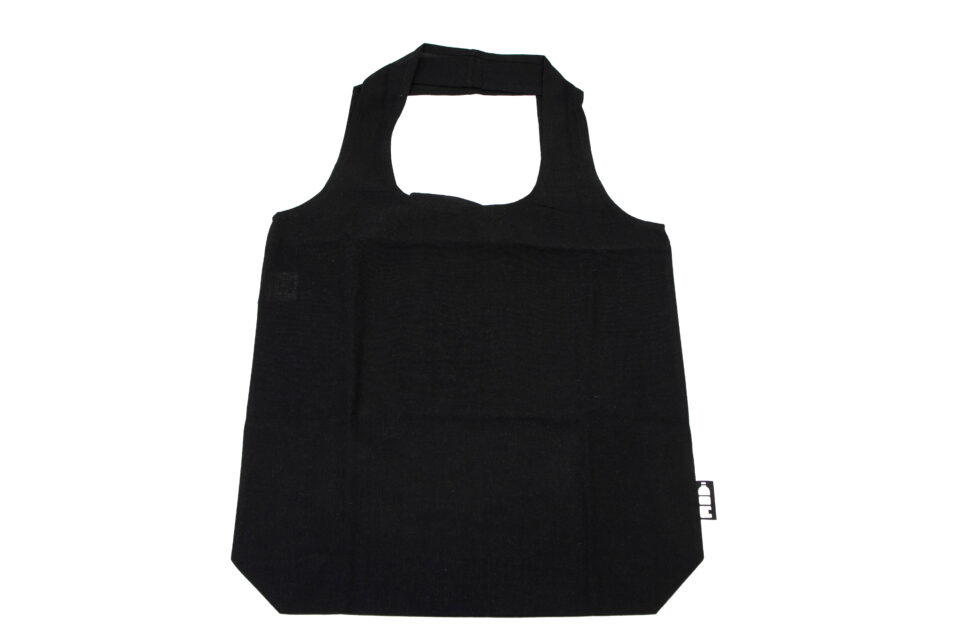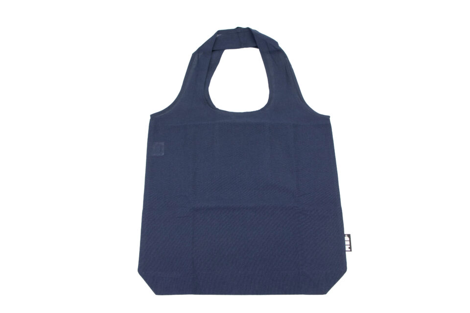 Zložljiva nakupovalna vrečka iz recikliranega bombaža, kompaktna in priročna, z dolgimi ročaji in zadrgo.